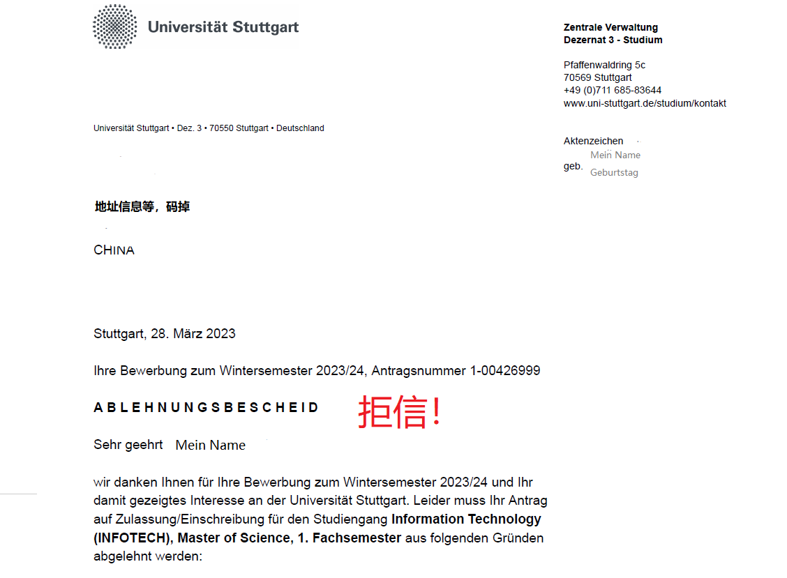 2023 年 3 月 28 日下午,收到斯图加特大学的 ABLEHNUNGSBESCHEID(拒信)💀